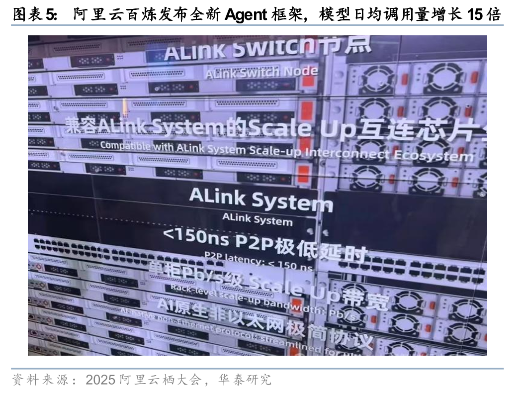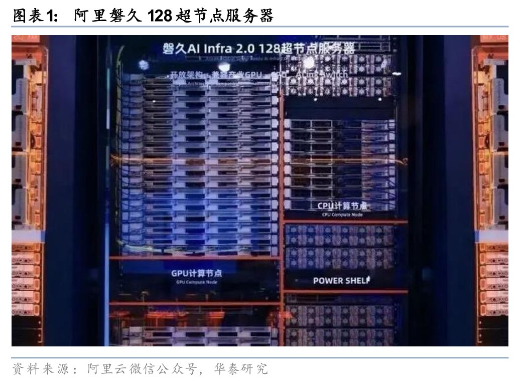 超节点:国内算力基础设施统一转向超节点形态,通过高度集成化设计,在机柜层面实现算力、网络、存储与供电的最优化。我们观察到,国内算力底层技术路径上开始收敛。在算力机柜/节点形式上,国内统一转向了超节点。阿里云发布全新一代磐久128超节点AI服务器,由阿里云自主研发设计,可支持多种AI芯片,单柜支持128个AI计算芯片。磐久超节点集成阿里自研CIPU 2.0芯片和EIC/MOC高性能网卡,采用开放架构,可实现Pb/s级别Scale-Up带宽和百ns极低延迟,相对于传统架构,同等AI算力下推理性能还可提升50%。从华为的CM384、阿里的磐久128、沐熙、腾讯、移动等超节点样机中,我们观察到明确的超节点趋势:国内在单卡能力不足的现实下,通过通信网络、供电、存储等工程方面的优化,实现超节点形式来补齐单卡的短板。我们认为,未来超节点的批量出货或将为国内节点代工、铜缆、光模块、液冷等板块带来新的增长机遇。