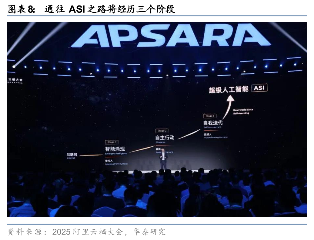 AGI只是起点,ASI才是终极目标。阿里巴巴集团CEO、阿里云智能集团董事长兼CEO吴泳铭在会上发表主旨演讲,他认为实现通用人工智能(AGI)已是确定性事件,但这只是起点,终极目标是发展出能自我迭代、全面超越人类的超级人工智能(ASI)。吴泳铭指出:AGI的目标是将人类从80%的日常工作中解放出来,让我们专注于创造与探索。而ASI作为全面超越人类智能的系统,将可能创造出一批“超级科学家”和“全栈超级工程师”。ASI将以难以想象的速度,解决现在未被解决的科学和工程问题,比如攻克医学难题、发明新材料、解决可持续能源和气候问题,甚至星际旅行等等。ASI将以指数级的速度推动科技的飞跃,引领人类进入一个前所未有的智能时代。